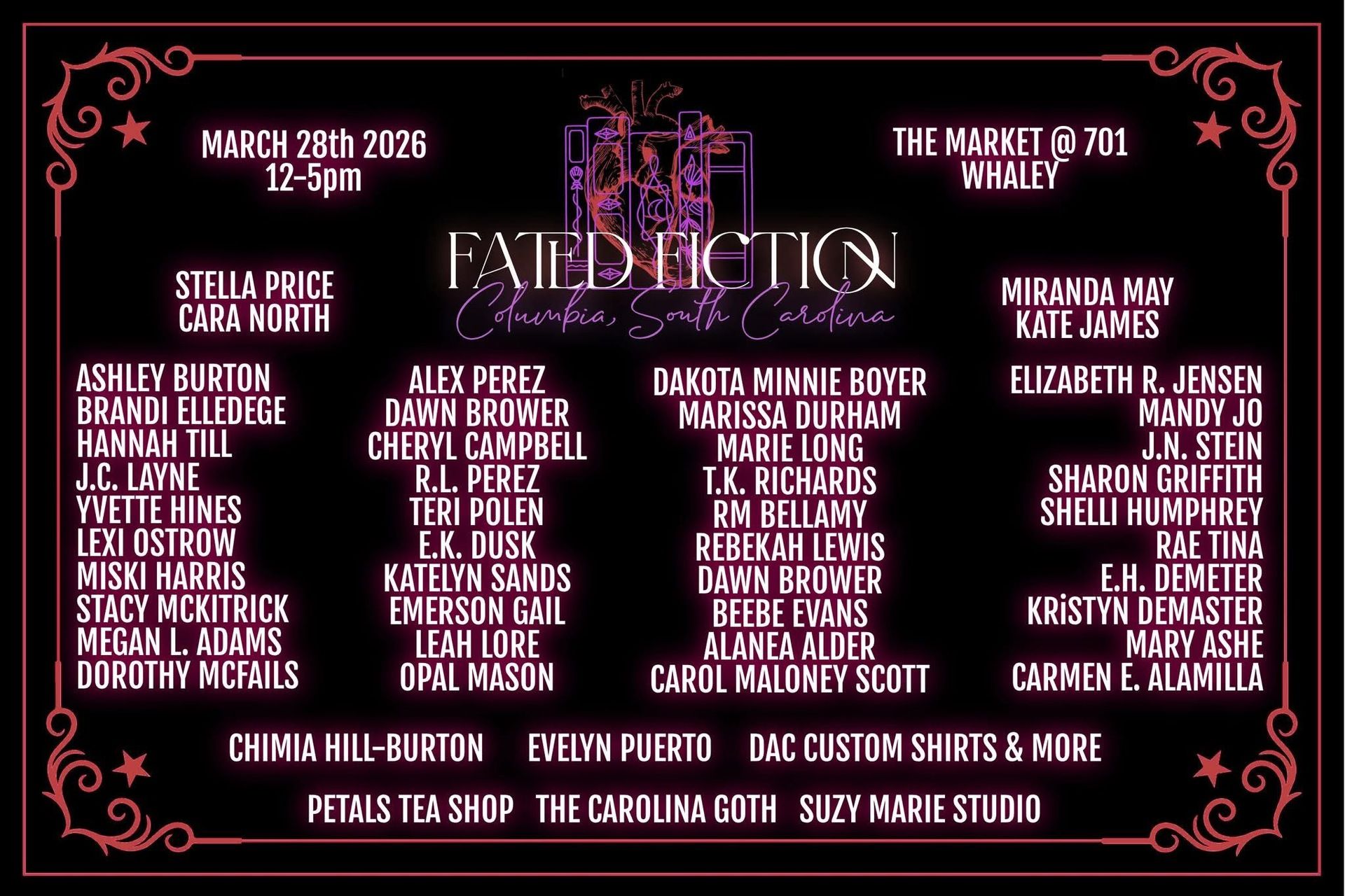 FREE tickets for the Fated Fiction book signing can still be reserved online at Event Brite! When: March 28th, 2026 from 12pm to 5pm EDT Where: 701 Whaley Street Columbia, SC 29201 I will have event exclusive pins and book marks to give away! (Pins are free for visiting the booth, bookmarks will be with purchase) |